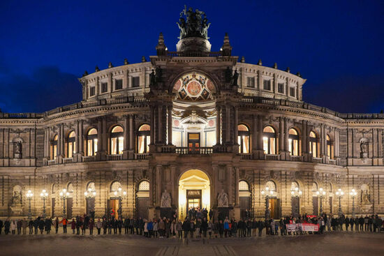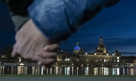 Auch an der wiederaufgebauten Frauenkirche lagen weiße Rosen neben flackernden Grablichtern. Das Gotteshaus gilt als Mahnmal der Angriffe und wurde auch mit Spenden von den einstigen Alliierten nach 1990 originalgetreu wiedererrichtet. Dort wurde die übliche "Nacht der Stille" diesmal zur "Nacht der Stimmen" für die Demokratie