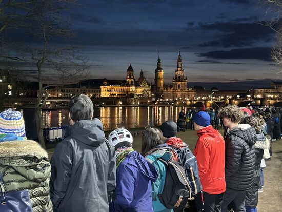 Zum Geläut der Innenstadtkirchen standen sie für einige Minuten zusammen und gedachten der Opfer vom 13. Februar 1945 in Dresden, aber auch der Opfer deutscher Bomben 1940 in Dresdens englischer Partnerschaft Coventry. Auch an die Millionen Toten der nationalsozialistischen Gewaltherrschaft wurde mit der Menschenkette erinnert, die an diesem Gedenktag seit über einem Jahrzehnt Tradition hat.