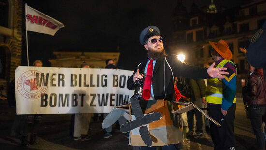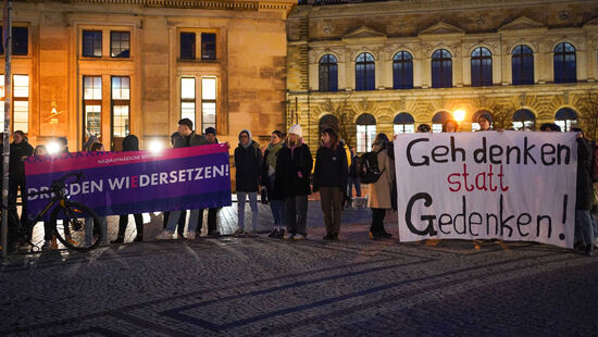 Unser Reporter vor Ort berichtete, dass sich bis zu 30 Personen am Abend auf dem Theaterplatz an der Semperoper aus der Menschenkette herauslösten. Sie wollten damit das Gedenken in der jetzigen Form kritisieren. Es würde in ihren Augen vor allem den "Opfermythos" von Dresden bestärken.
