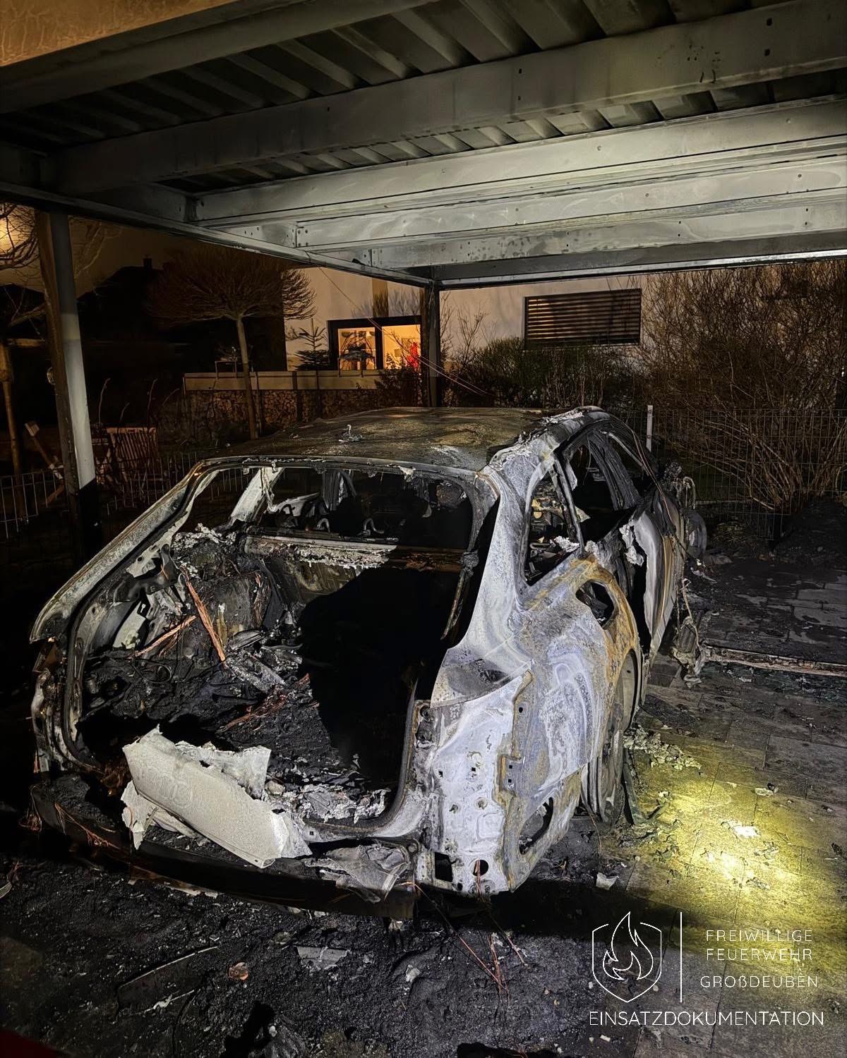 In Böhlener Stadtteil Großdeuben ist aus bislang unbekannter Ursache am Freitagmorgen kurz nach 2 Uhr ein Audi A6 Avant in Flammen aufgegangen. Das Auto stand unter dem Carport eines Einfamilienhauses. Ein Ausbreiten des Feuers auf das Wohngebäude konnte durch die Feuerwehren Großdeuben, Böhlen und Markkleeberg verhindert werden. Allerdings wurden neben dem Audi auch der Carport und ein daneben stehendes Auto beschädigt. Verletzt wurde niemand. Der Schaden wurde allerdings mit rund 80.000 Euro beziffert.