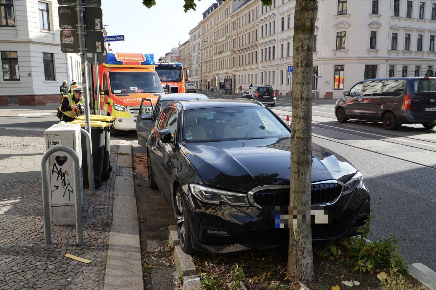 Am Freitagmittag hat es auf der Georg-Schumann-Straße in Leipzig-Gohlis geknallt - kurz nach 12 Uhr. Nach ersten Informationen ist eine ältere Autofahrerin gegen einen parkenden BMW mit Berliner Nummernschild gekracht. Der wurde durch den Aufprall noch gegen einen Baum geschoben. Unfallursache waren vermutlich gesundheitliche Probleme bei der Autofahrerin, hieß es laut einem Reporter an der Unfallstelle.