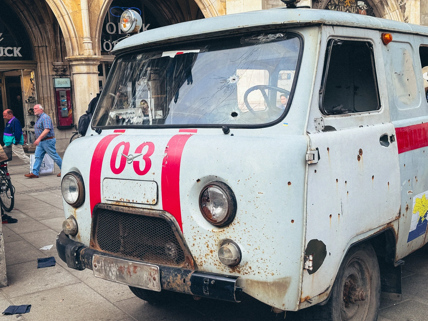 Ein Zeugnis der Gewalt und des Terrors in der Ukraine, kann am 14.und 15.Oktober in Dresden hautnah angesehen werden. Vor dem Kulturpalast und vor der Frauenkirche wird ein beschossener ukrainischer Krankentransport gezeigt.