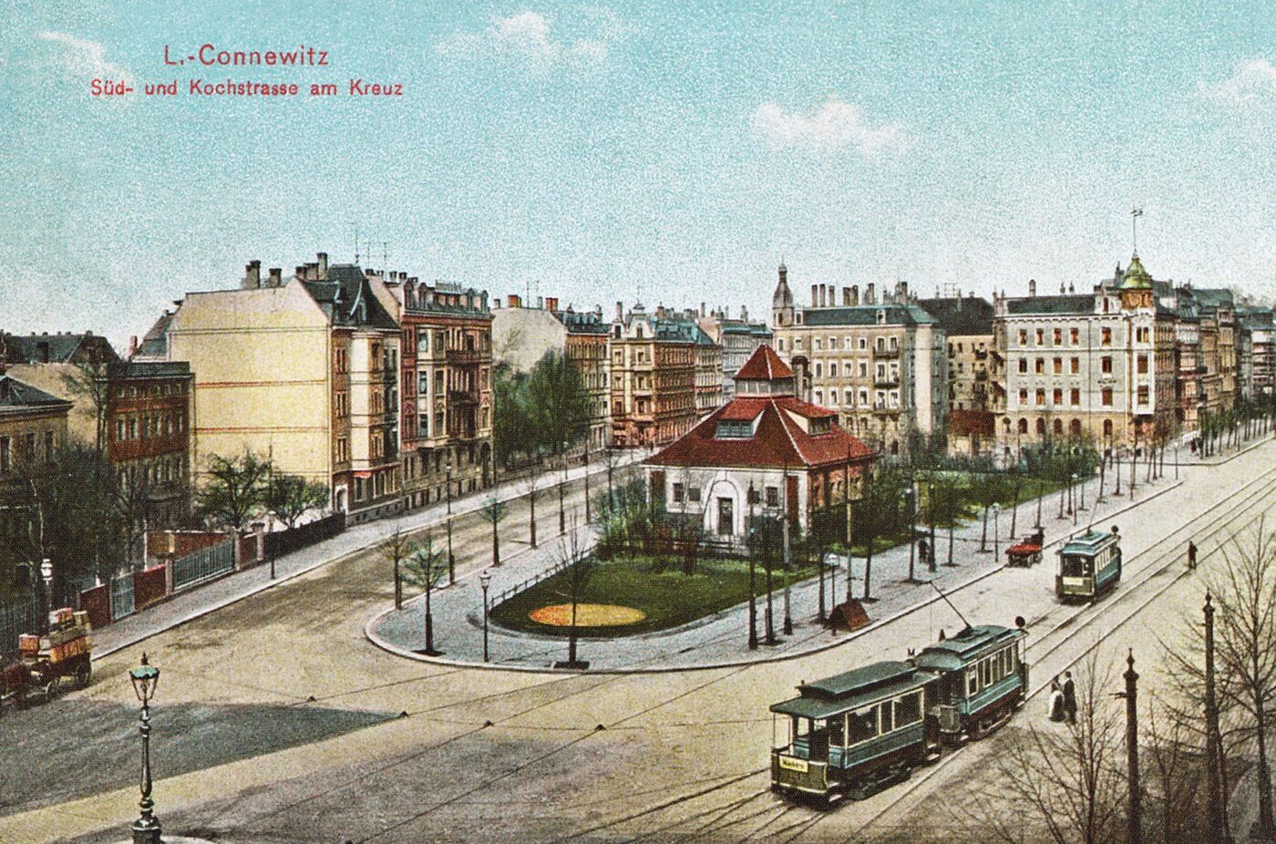 - Eine alte Postkarte: So sah es früher am Connewitzer Kreuz mit dem Volksbrausebad (heute "Südbrause - bei Freunden") aus.