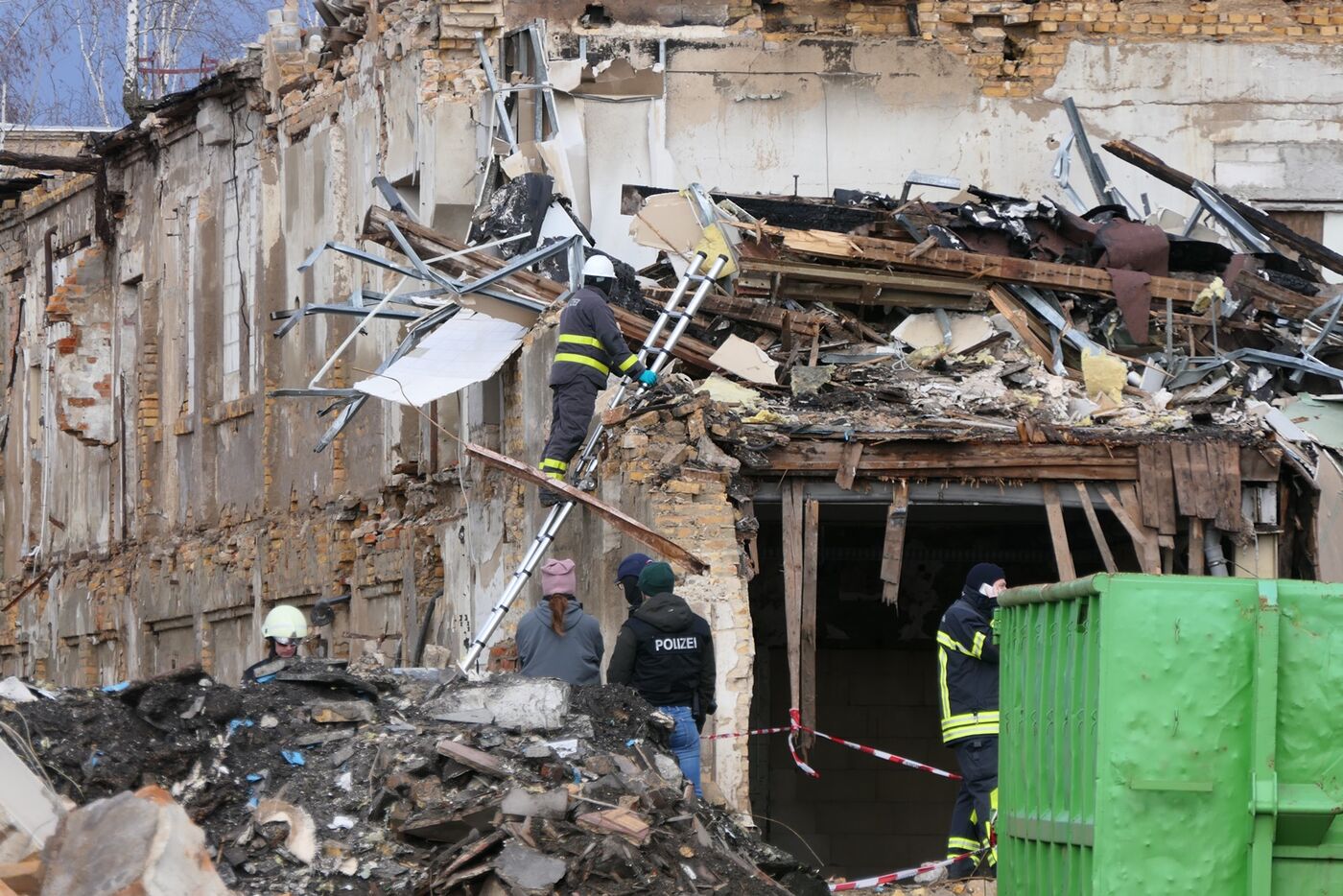 - Die Ermittlungen in der halb abgerissenen Brandruine des früheren Produktionsgebäudes vom VEB Sachsenpelz gestalten sich schwierig.