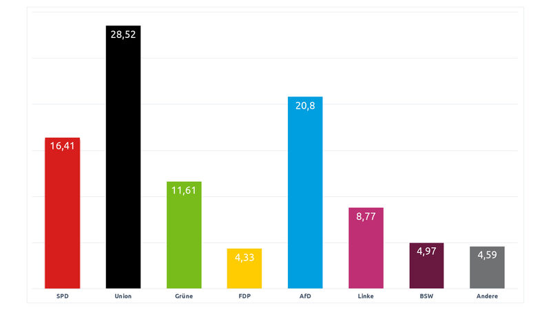 Die Union kommt nach dem vorläufigen Ergebnis auf 28,6 Prozent (Wahl 2021: 24,1 Prozent). CDU-Chef Merz hat nun beste Chancen, nächster Kanzler nach Olaf Scholz (SPD) zu werden - dieser bleibt aber zunächst im Amt. Merz hat angekündigt, spätestens bis Ostern eine Regierung bilden zu wollen. Auf X schrieb er, Europa warte auf Deutschland. „Wir müssen jetzt wieder schnell handlungsfähig werden.“