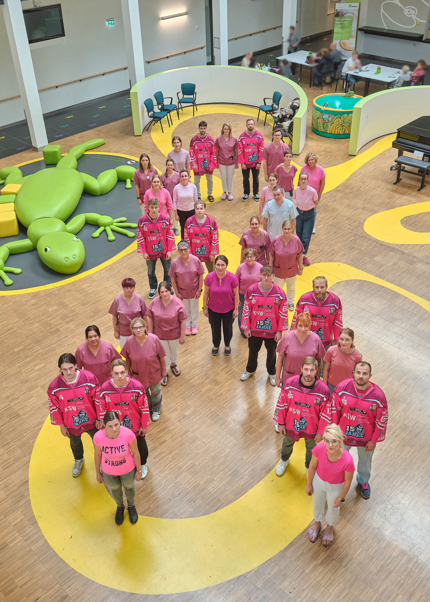 - Eishockeyprofis aus dem IceFighters-Team mit Mitarbeitern des Brustzentrums der Universitätsklinik Leipzig im Gebäude der Uni-Kinderklinik.