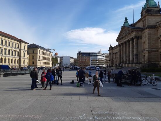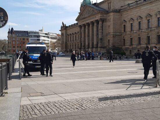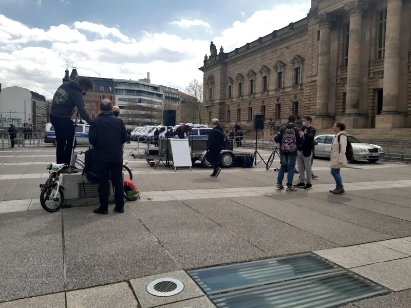 Auf dem Simsonplatz vor dem Bundesverwaltungsgericht laufen die letzten Vorbereitungen für die Versammlungen. Dort hat die coronakritische "Bewegung Leipzig" eine Kundgebung mit 500 Teilnehmern angemeldet. Auch das Aktionsnetzwerk "Leipzig nimmt Platz" will dort mit 300 Menschen demonstrieren. Die Polizei ist ebenfalls vor Ort.