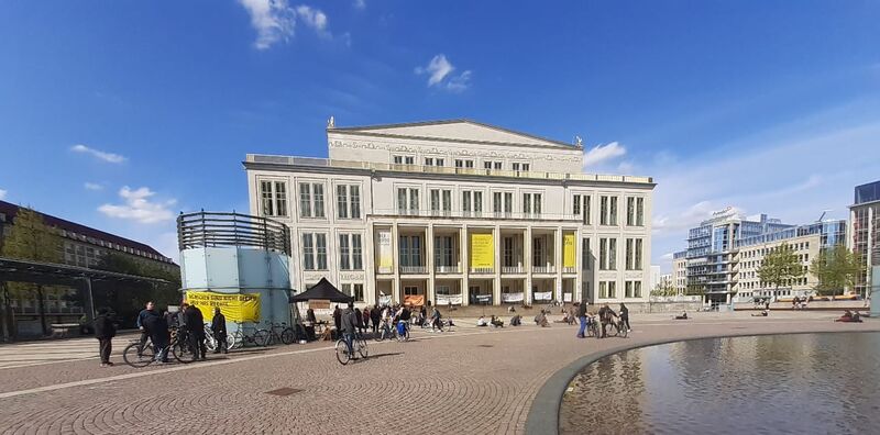 Während auf dem Simsonplatz weiter lautstark demonstriert wird, läuft auf dem Augustusplatz eine friedliche Mahnwache der "Seebrücke Leipzig". Dort wird seit etwa 14 Uhr für die Evakuierung aller Lager an den EU-Außengrenzen protestiert. Statt der angemeldeten 500 Teilnehmer sind etwa 30 Menschen vor Ort. Die Mahnwache soll bis Sonntagabend 19 Uhr dauern. Einige Teilnehmer werden deshalb voraussichtlich auch über Nacht auf dem Platz vor der Oper bleiben.