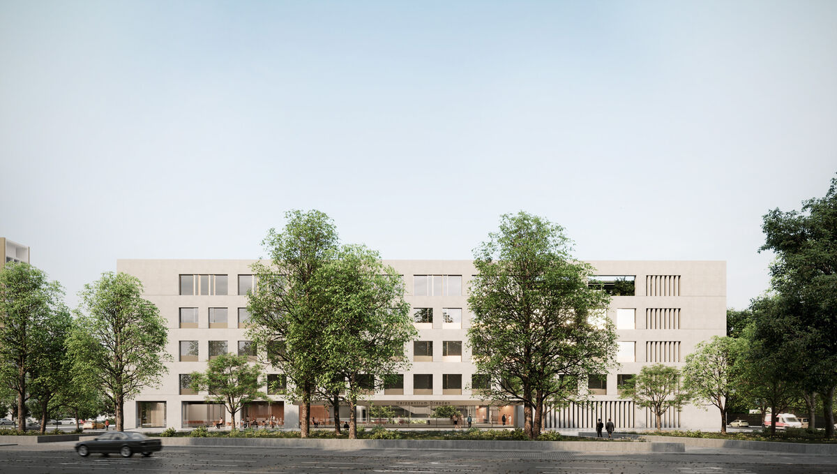 - Visualisierung Herzzentrum aus der Perspektive Blasewitzer Straße. Entwurf von 11/23
