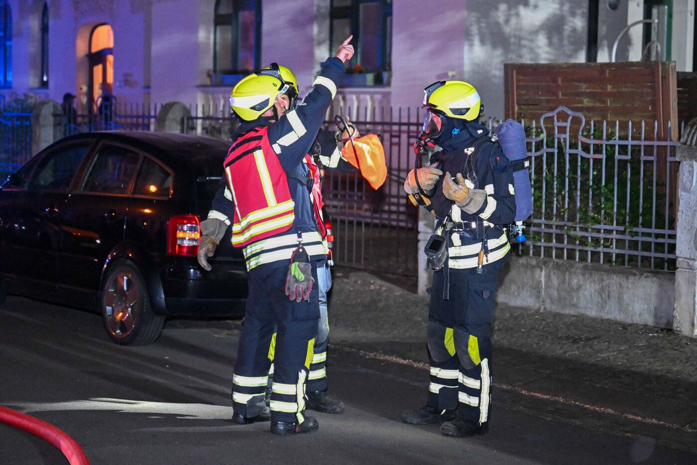 - Der Einsatzleiter zeigt seinen Kollegen etwas bei dem brennenden Haus.