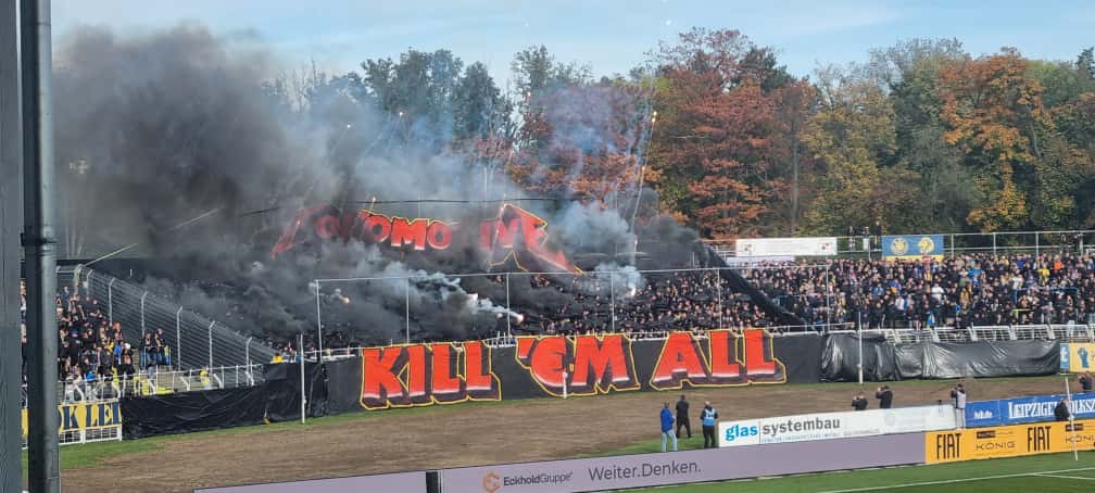 Grund dafür: Die Polizei hatte bereits am Morgen knapp 300 Chemie-Fans festgesetzt, weil diese ohne vorherige Anmeldung durch Leipzig zogen. Zu Spielbeginn zündeten einige Lok-Fans Pyrotechnik, dunkler Qualm stieg auf.