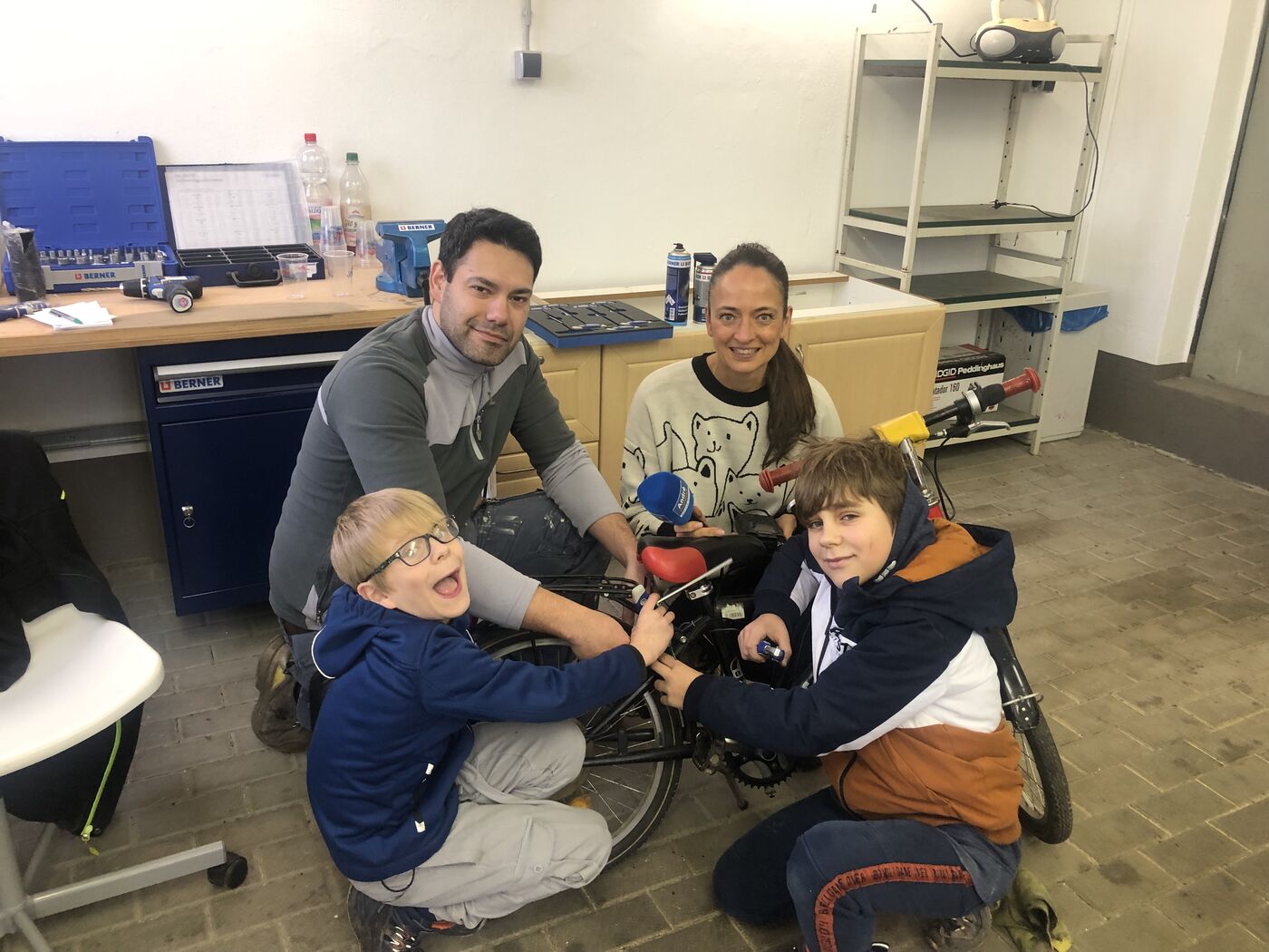 Jetzt so kurz vor der Fahrradsaison konnte aus dem Spendentopf eine Hobbywerkstatt finanziert werden. Nach einer gründlichen Einweisung und Werkzeugkunde ging es für Justin und Jeremy direkt an die Räder der Sonnenblumengruppe.