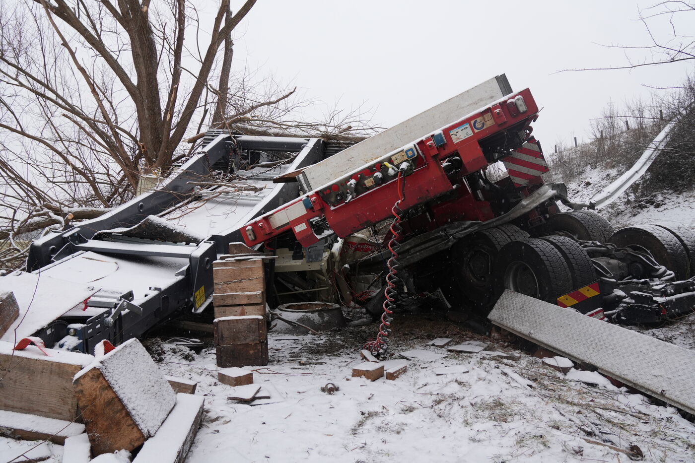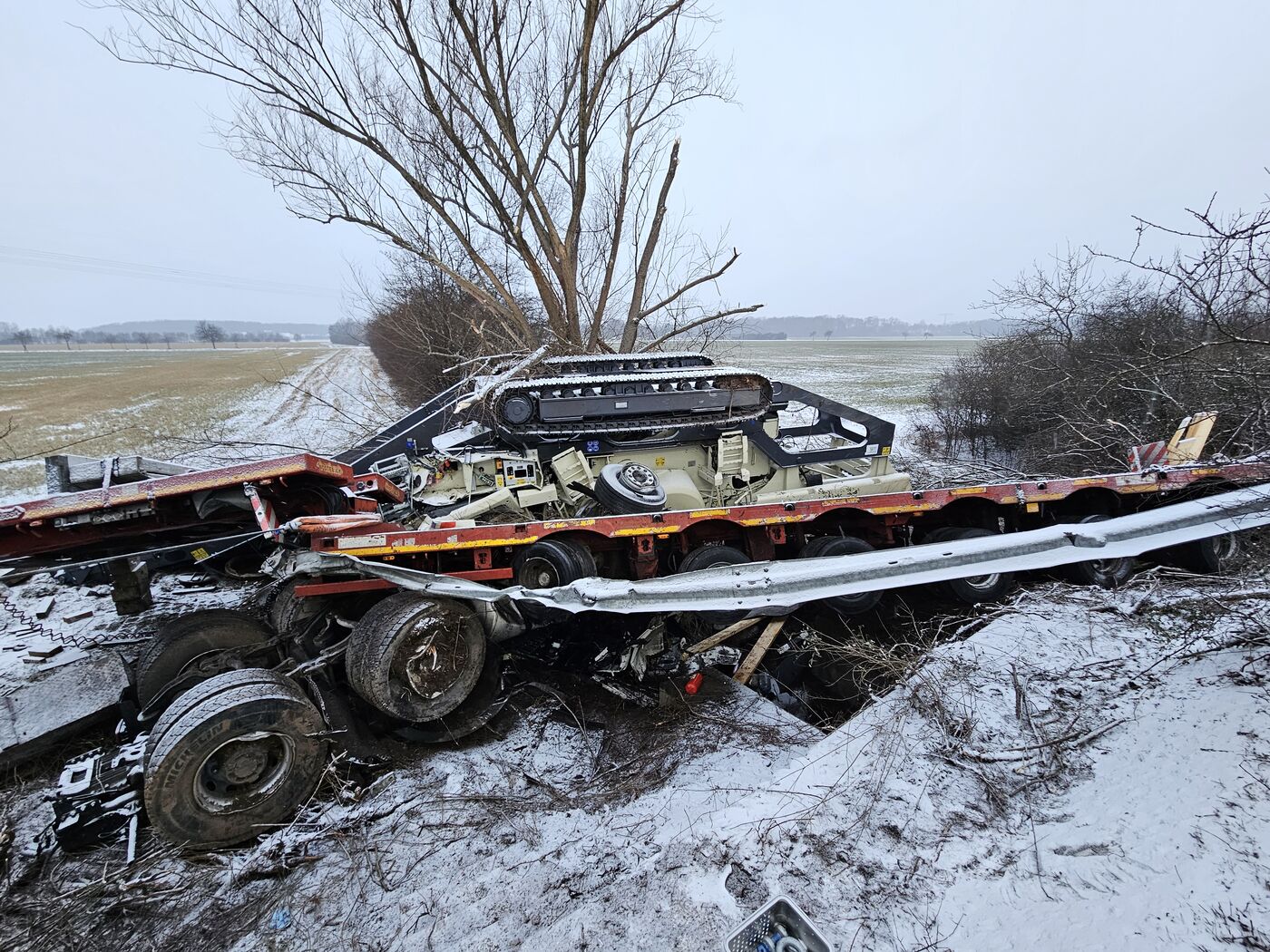 Schrecklicher Unfall am Montagmorgen auf der A9 zwischen den Anschlussstellen Großkugel und Leipzig-West in Richtung Nürnberg: Ein Lkw, der mit einem Raupenbagger beladen war, ist gegen 4.30 Uhr erst in die Mittelplanke gekacht und dann rechts in den Graben gerutscht. Dabei überschlug sich das Gespann und das Führerhaus des Lkw wurde offenbar teilweise unter dem Bagger begraben.