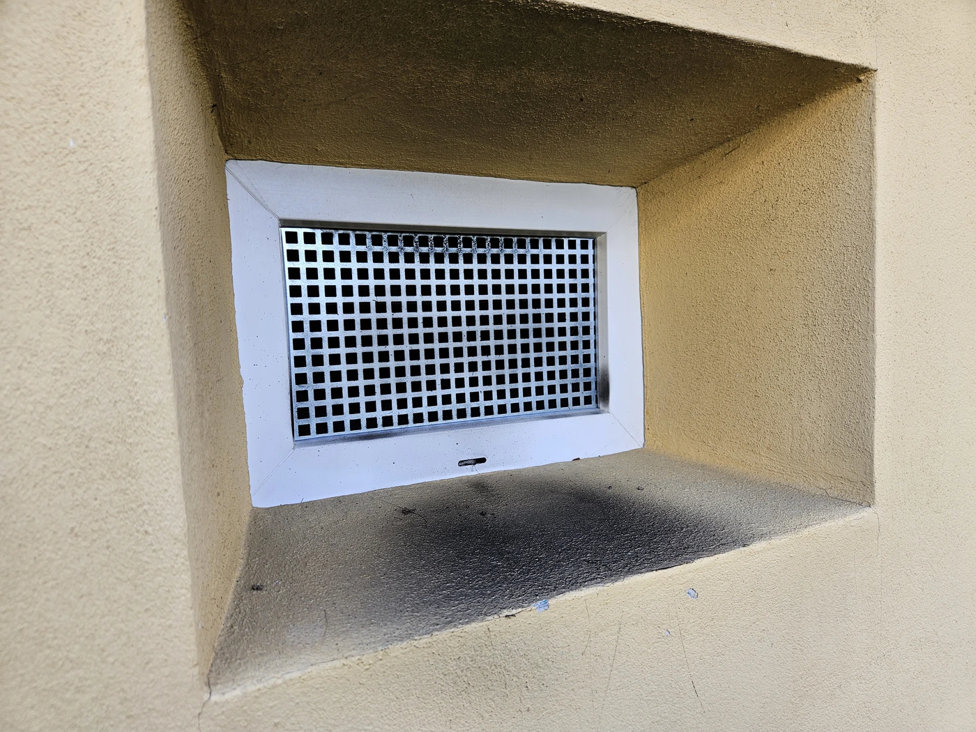 - Die Spuren des Brandes sind auch am Kellerfenster sichtbar.