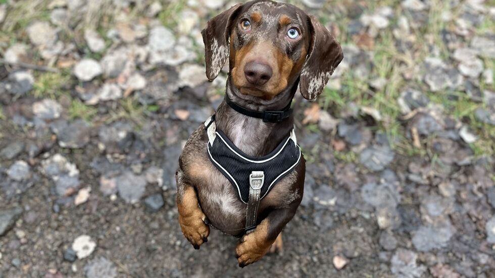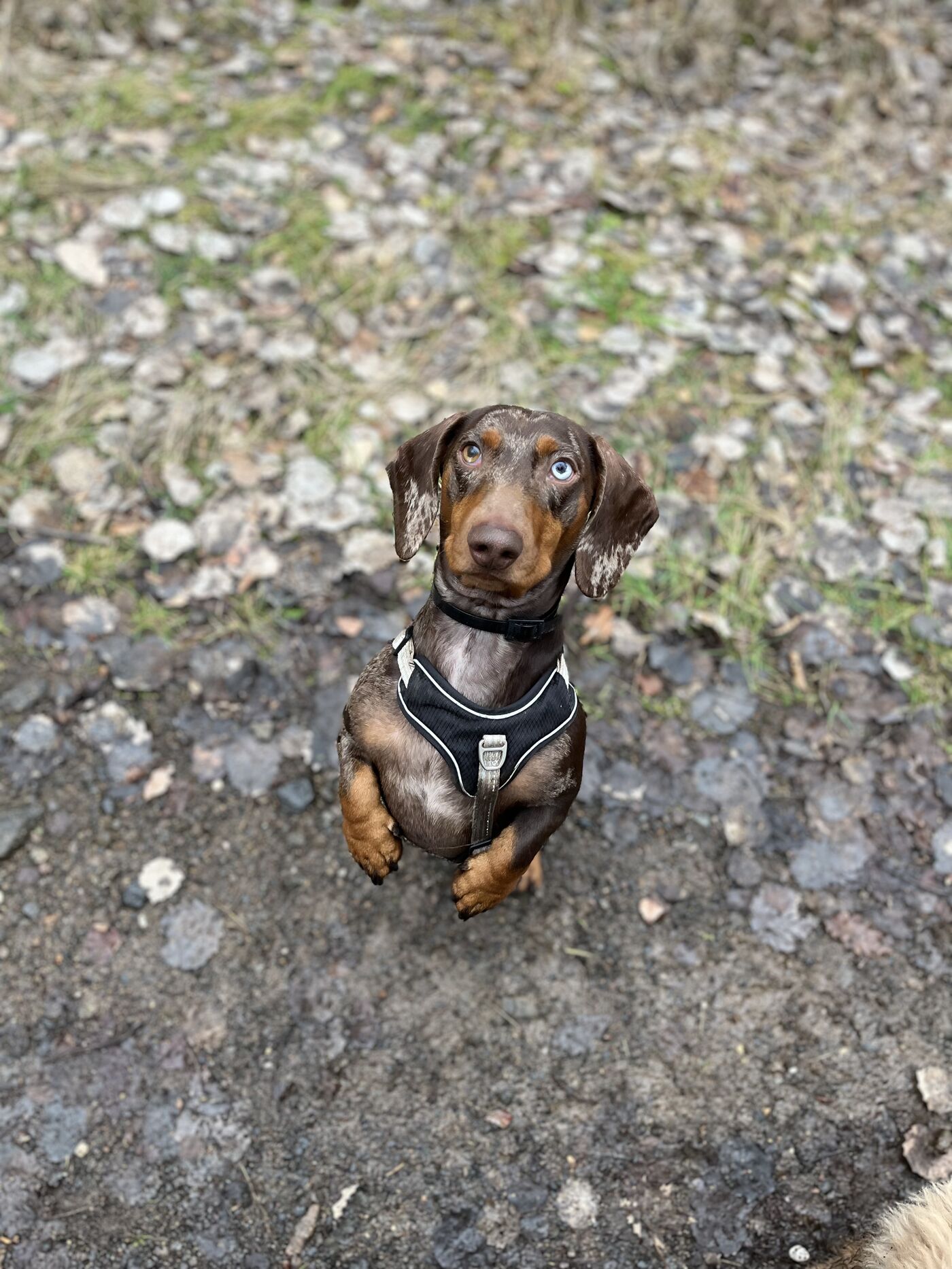 Dackel- tigerfarben, braun, Standard kurzhaar. Ein blaues und ein braunes Auge