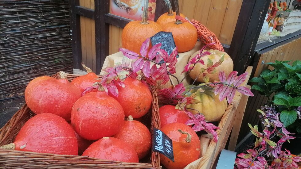 Nach dem Rundgang könnt ihr in der Kürbisküche leckere Kürbisgerichte probieren oder auf dem Herbstmarkt nach kleinen Schätzen stöbern. Das Kürbis-Wunderland ist bis zum 16. November geöffnet.