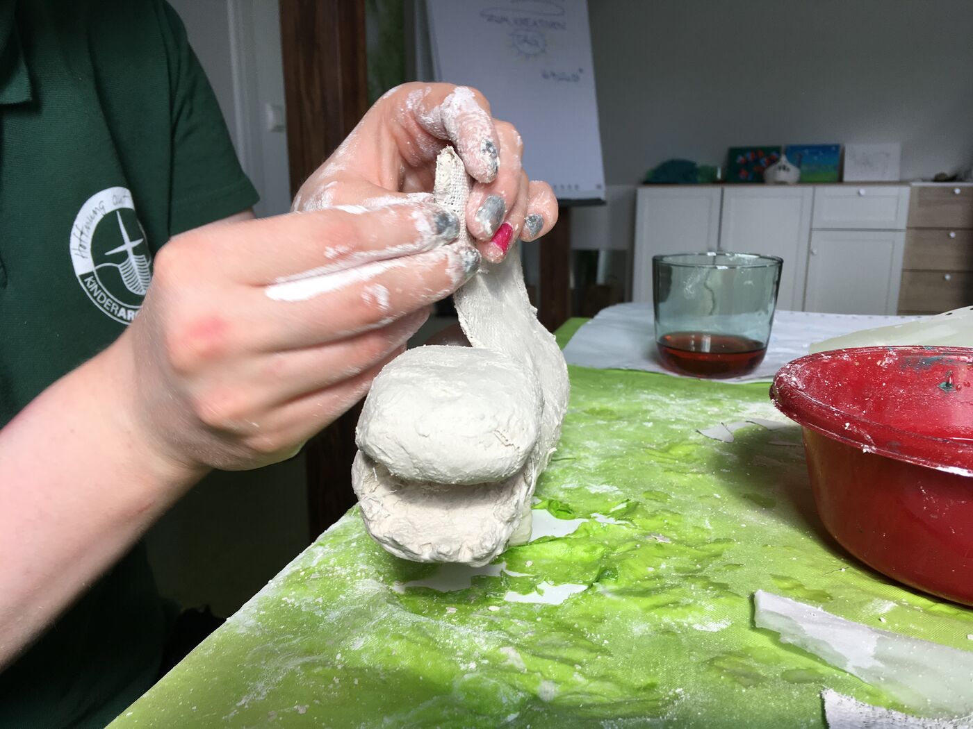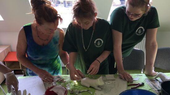 „Jeder Eindruck braucht einen Ausdruck“ - das ist das Motto von Kunsttherapeutin Uta Welcker-Annies. Die Jugendlichen in der heilpädagogisch-therapeutischen Wohngruppe in Naundorf können durch die kreative Arbeit Erlebtes aufarbeiten und Gefühle nonverbal umsetzen. Nach einer kurzen Meditation wurden kleine Skizzen gefertigt und dann ging es auch schon an den Gips. Entstanden sind wunderbare Phantasiewesen mit Eigenschaften, die die Kinder schon haben oder gerne hätten. Die ganze Gruppe war mit Begeisterung dabei und zum Schluss war jeder stolz auf sein eigenes Werk. Eine unglaublich wichtige Erfahrung für die Kids!