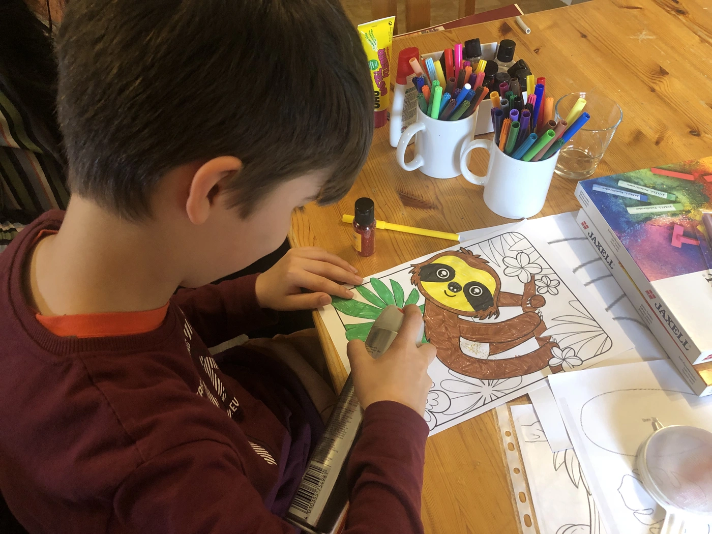 Der achtjährige Carl malt und bastelt bei der Kunsttherapie am liebsten Faultiere und er ist davon überzeugt: „Die sind gar nicht faul, die sparen nur Energie“.