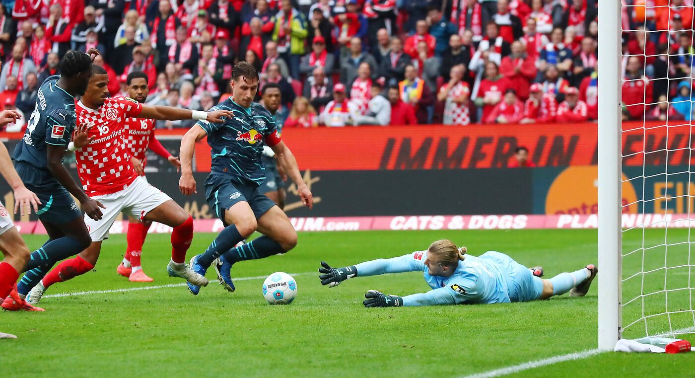 Nach dem Seitenwechsel bemühten sich die Mainzer zwar um den Anschlusstreffer, doch wirklich zwingend waren die Aktionen lange Zeit nicht. Die bis dahin beste Chance der Rheinhessen hatte Anthony Caci (67.). Seinen Schuss konnte Leipzigs Torwart Peter Gulacsi gerade noch abwehren. Auf der Gegenseite lief Benjamin Sesko gleich zweimal alleine auf das Mainzer Tor zu, scheiterte jedoch am jeweils stark parierenden Zentner (70./72.). Am ungefährdeten Sieg der Leipziger änderte das nichts (mit dpa).