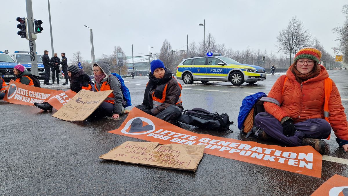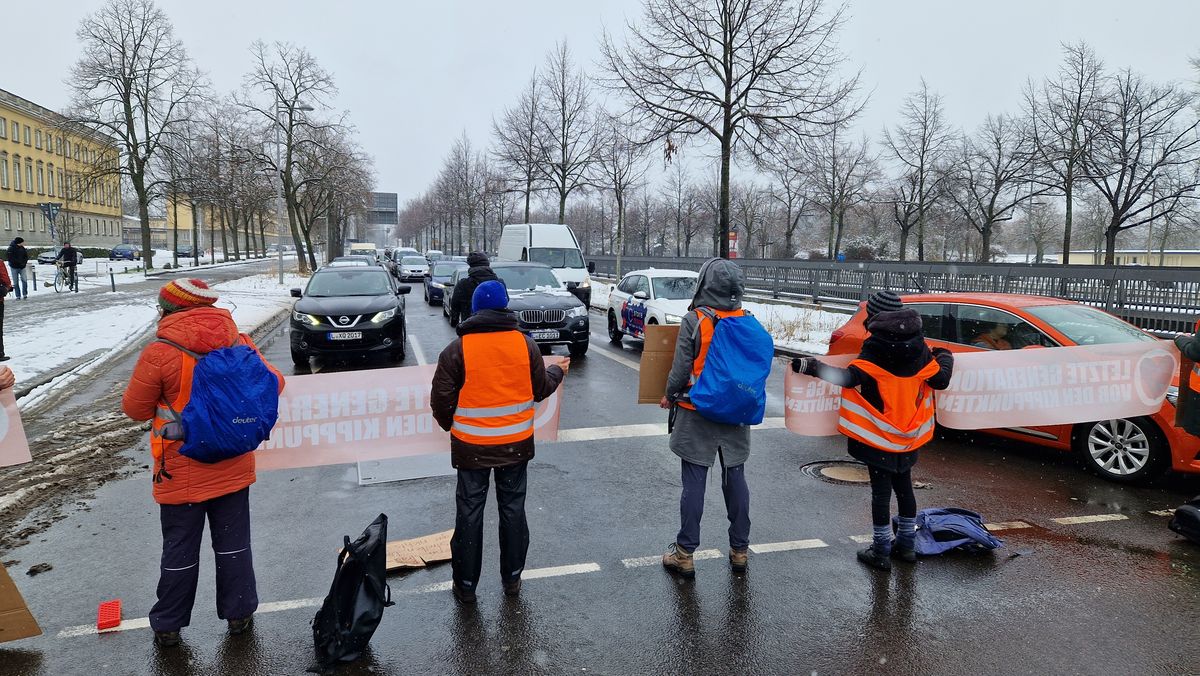 - Mitglieder der "Letzten Generation" haben sich auf der Jahnallee festgeklebt.