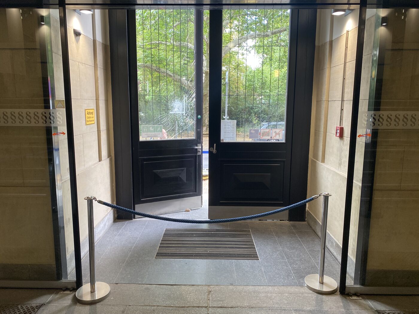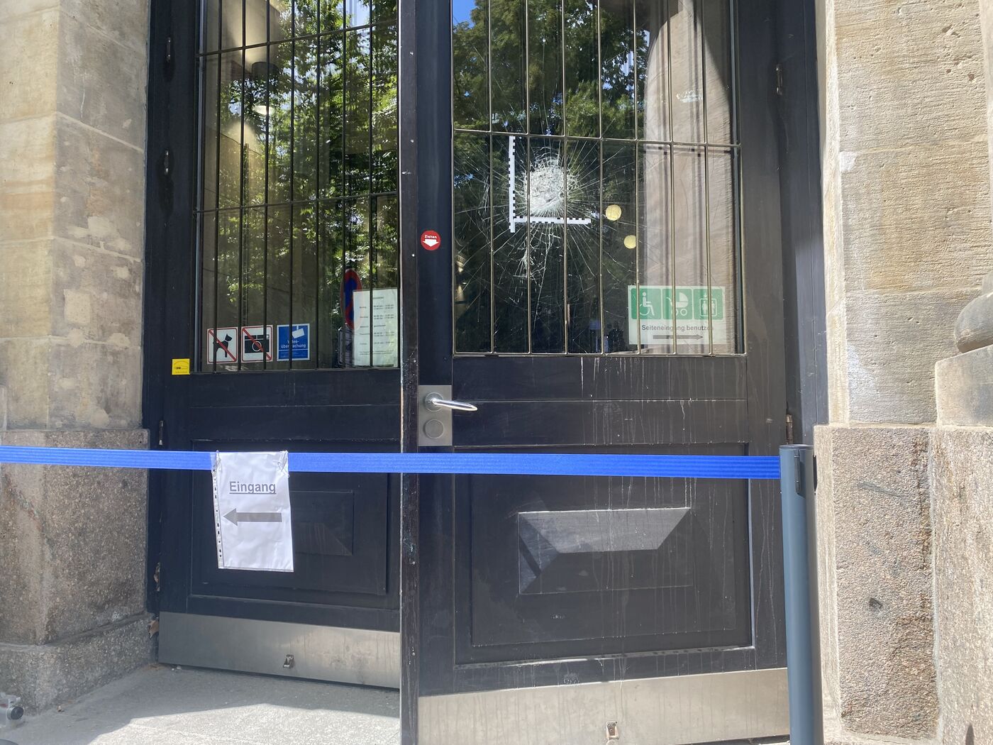 - Die Scheibe an der Eingangstür des Leipziger Amtsgerichtes ist gesplittert.