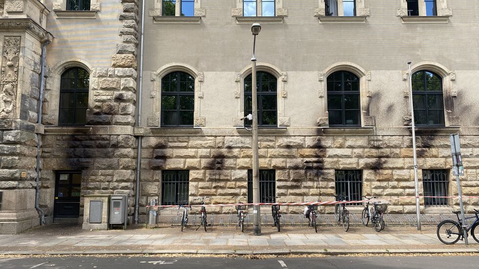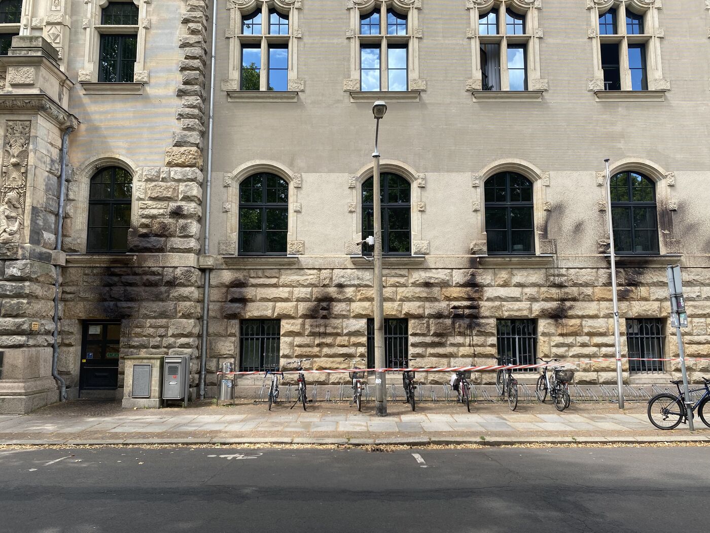 Unbekannte haben in der Nacht zu Montag das Leipziger Amtsgericht mit Steinen beworfen und großflächig mit schwarzer Farbe beschmiert. Durch das gesplitterte Glas in der Eingangstür wurde noch eine Flüssigkeit geschüttet - offenbar Buttersäure.