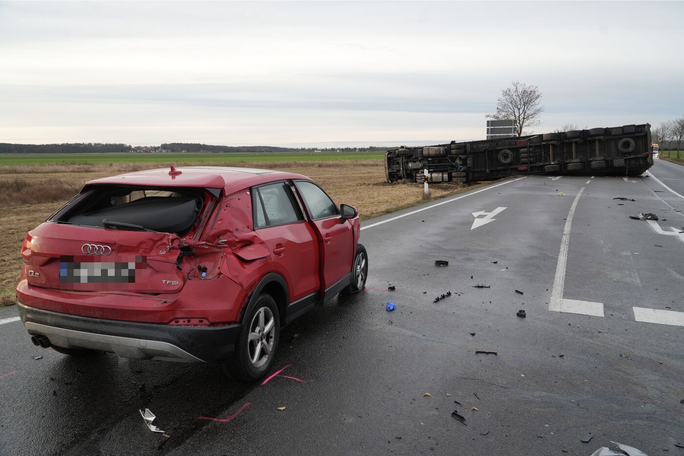 Laut Polizei habe der Audi-Fahrer (34) nach links auf die B 87 abbiegen wollen und den Lkw dabei übersehen. Beim Zusammenstoß kippte der Sattelzug um. Der Trucker (51) wurde dabei schwer verletzt und später ins Krankenhaus gebracht. Der 34-Jährige und sein 2-jähriges Kind blieben unverletzt, kamen aber zur Beobachtung ebenfalls ins Krankenhaus. Der Schaden wurde auf über 50.000 Euro geschätzt.