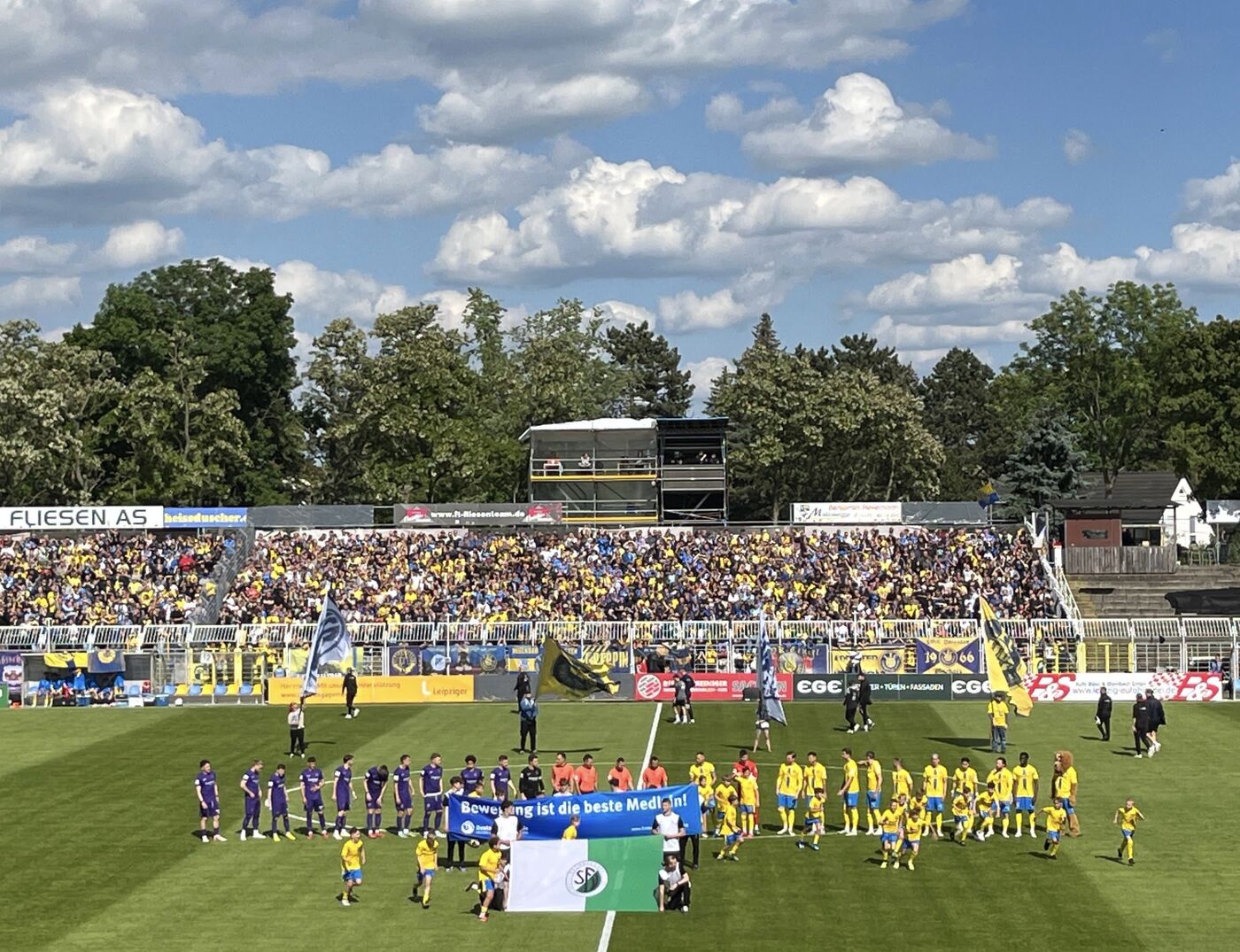 Das Stadion ist mit 12.154 Zuschauern ausverkauft. Der blaue Himmel wird malerisch von weißen Schäfchenwolken geschmückt. Auch die etwa 2000 Auer Fans sind heute ganz in weiß gekleidet. Ansonsten ist das Stadion aber ganz in Blau und Gelb getaucht.