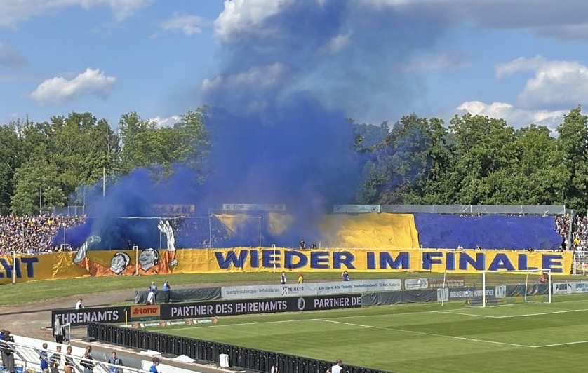 Die Lok-Fans breiten zu Beginn der Partie ein Banner aus: „Der 1. FCL steht wieder im Finale“. Bei Aue: „FDGB Pokalsieger 1955“. Beide Fangruppen brennen Pyro in ihren Farben ab.