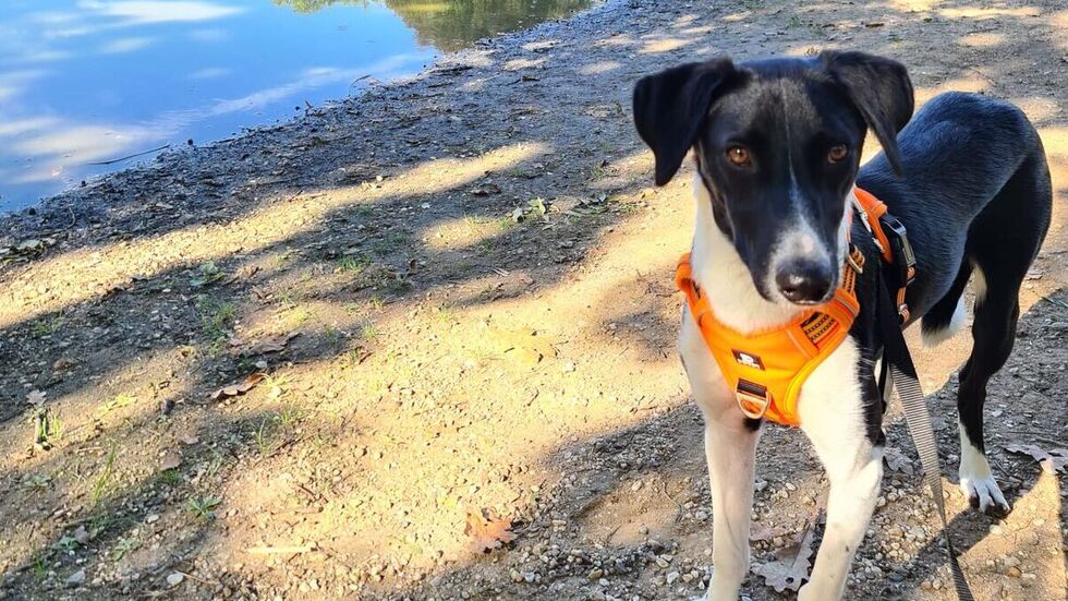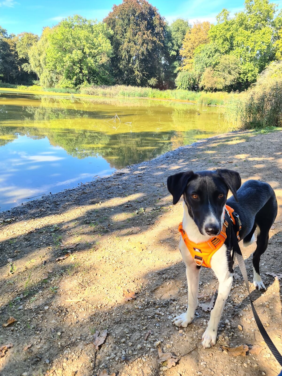 Jagdhundmischling, schwarzweiß, ca. 50 cm Schulterhöhe, oranges Geschirr