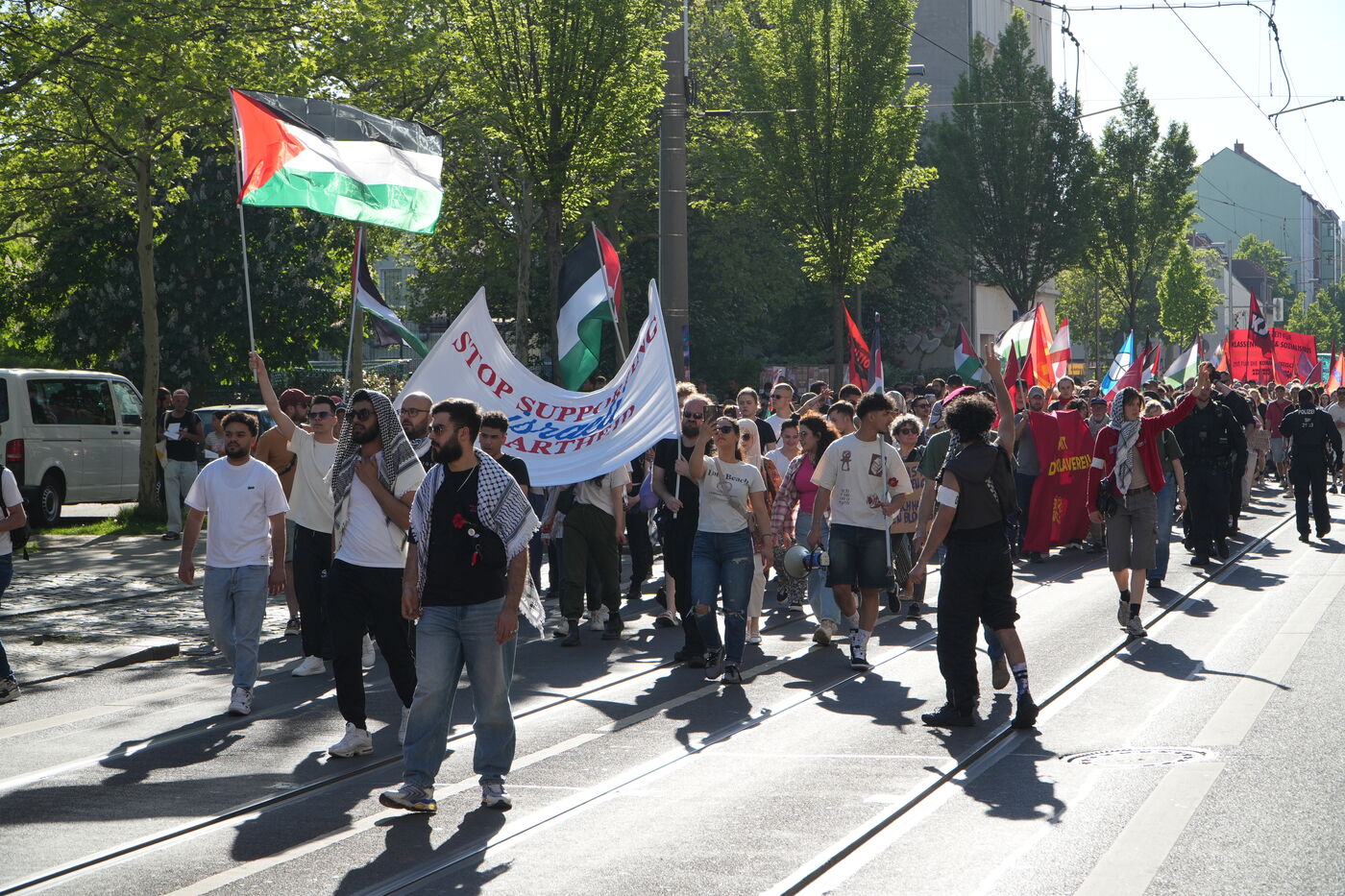 Bei einer Mai-Demo in Leipzig hat es am Donnerstagnachmittag mehrere unschöne Zwischenfälle gegeben. Etwa 2100 Menschen (Schätzung der Polizei), die auf Transparenten ihre Ablehnung gegen Israel zum Ausdruck brachten, zogen von der Südvorstadt zum Rabet. Vor allem offensichtlich Israel-Gegner.