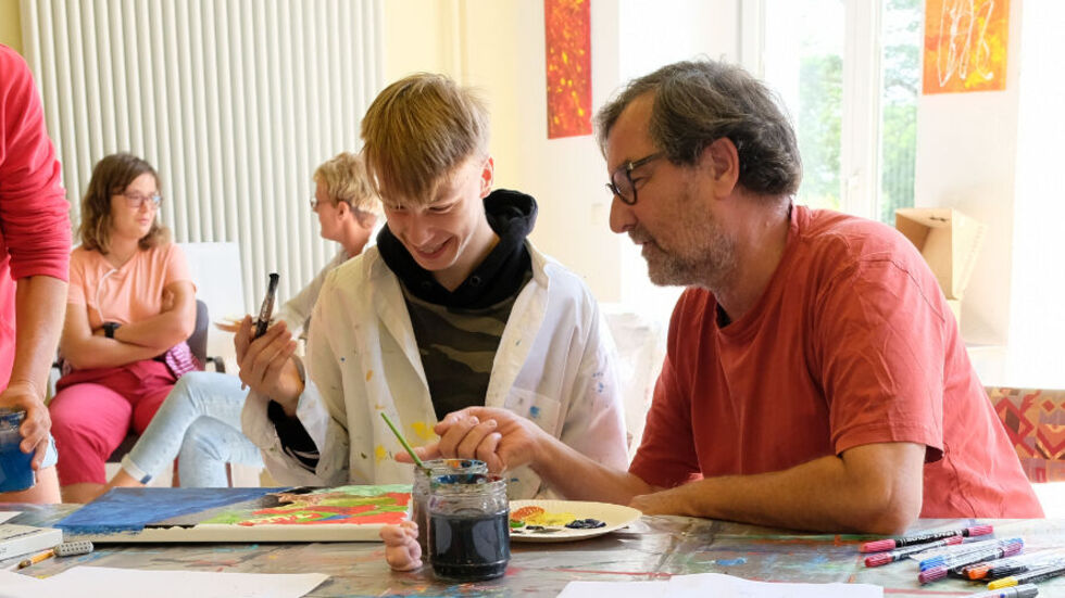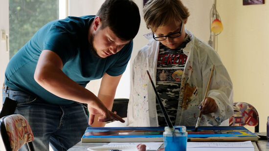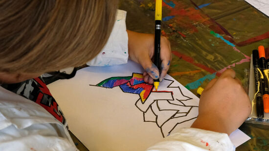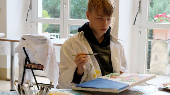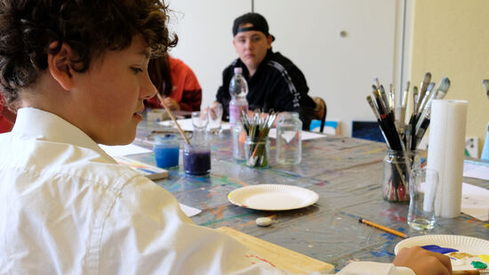 "Man kann hier einfach malen, was einem in den Sinn kommt", schwärmt Lion von dem Ferienangebot. Während ihn die Titanic fesselt, hat zum Beispiel der 13-jährige Jonas sein Gehirn auf der Leinwand festgehalten. Ein Star-Wars-Gefährt ist darin ebenso zu finden wie das Auge aus seinem Lieblingsfilm, aber auch eine Tür mit der Aufschrift "Nicht öffnen!" Maria aus dem Integrativen Familienwohnen dagegen hat ein abstraktes Bild geschaffen. "Ich schaue einfach, was auf der Leinwand entsteht, und lass mich von meinem Bild überraschen", sagt sie.