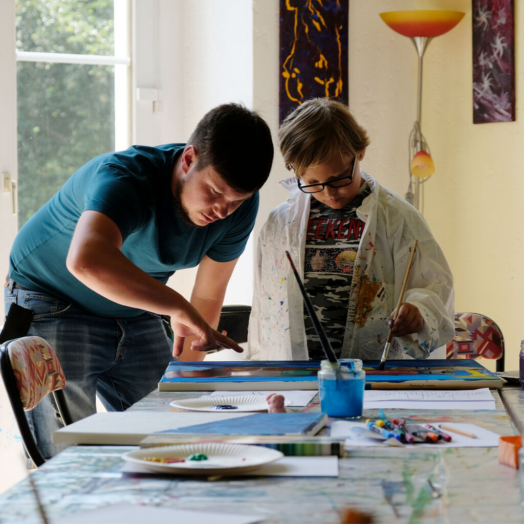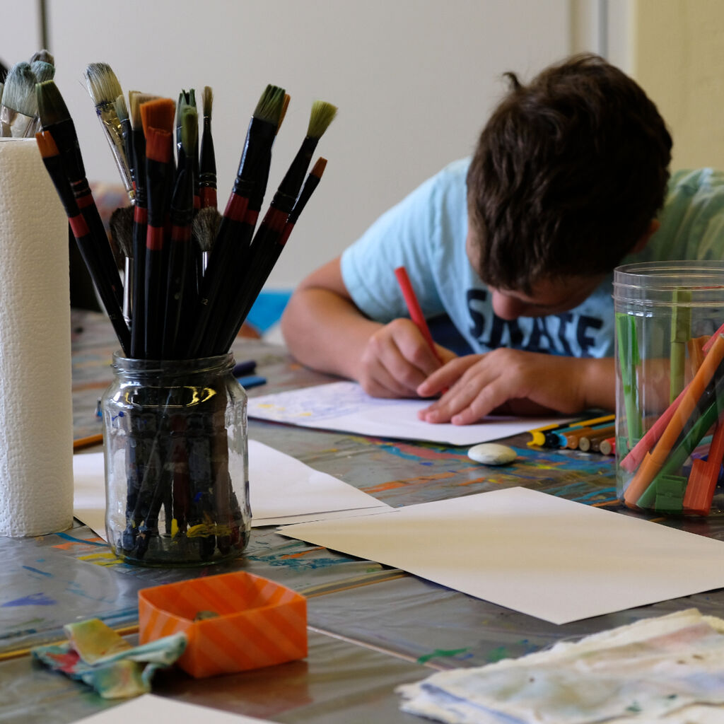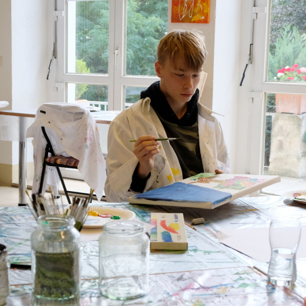 "Man kann hier einfach malen, was einem in den Sinn kommt", schwärmt Lion von dem Ferienangebot. Während ihn die Titanic fesselt, hat zum Beispiel der 13-jährige Jonas sein Gehirn auf der Leinwand festgehalten. Ein Star-Wars-Gefährt ist darin ebenso zu finden wie das Auge aus seinem Lieblingsfilm, aber auch eine Tür mit der Aufschrift "Nicht öffnen!" Maria aus dem Integrativen Familienwohnen dagegen hat ein abstraktes Bild geschaffen. "Ich schaue einfach, was auf der Leinwand entsteht, und lass mich von meinem Bild überraschen", sagt sie.