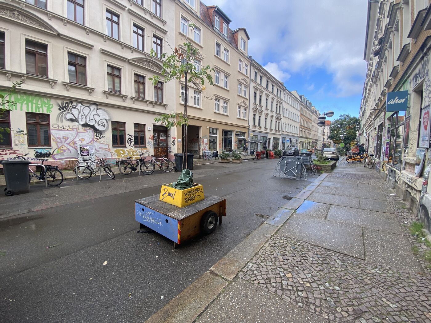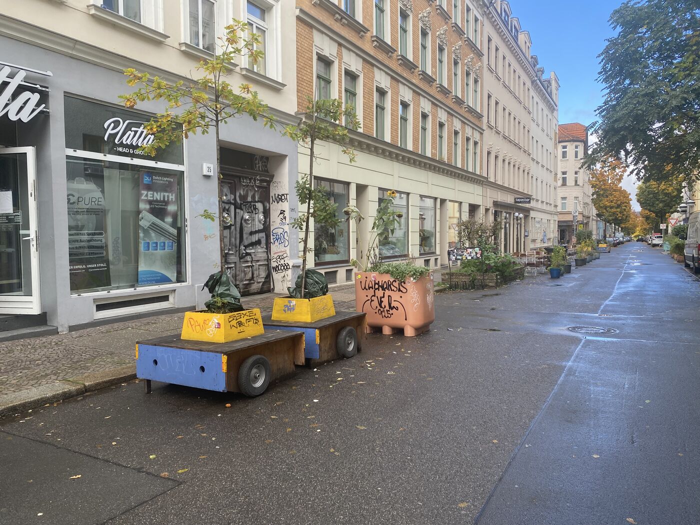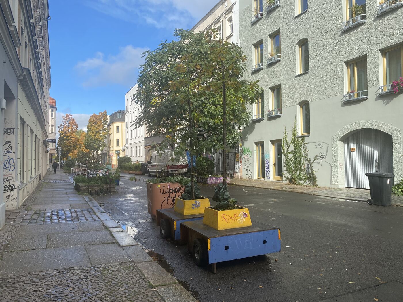 Die aktuelle Umsetzung mit fünf Bäumen auf der Merseburger Straße stelle „jedoch nur ein bewusstes Provisorium dar, um die Fußgängerzone zeitnah durch eine optische Entsprechung erlebbar zu machen.“ Ein Umbau des Straßenabschnitts sei perspektivisch geplant, doch wegen der Finanzlage nur in kleinen Abschnitten realisierbar. Auch am Liviaplatz und an der Gottschedstraße sei mobiles Grün derzeit im Einsatz, heißt es weiter.
