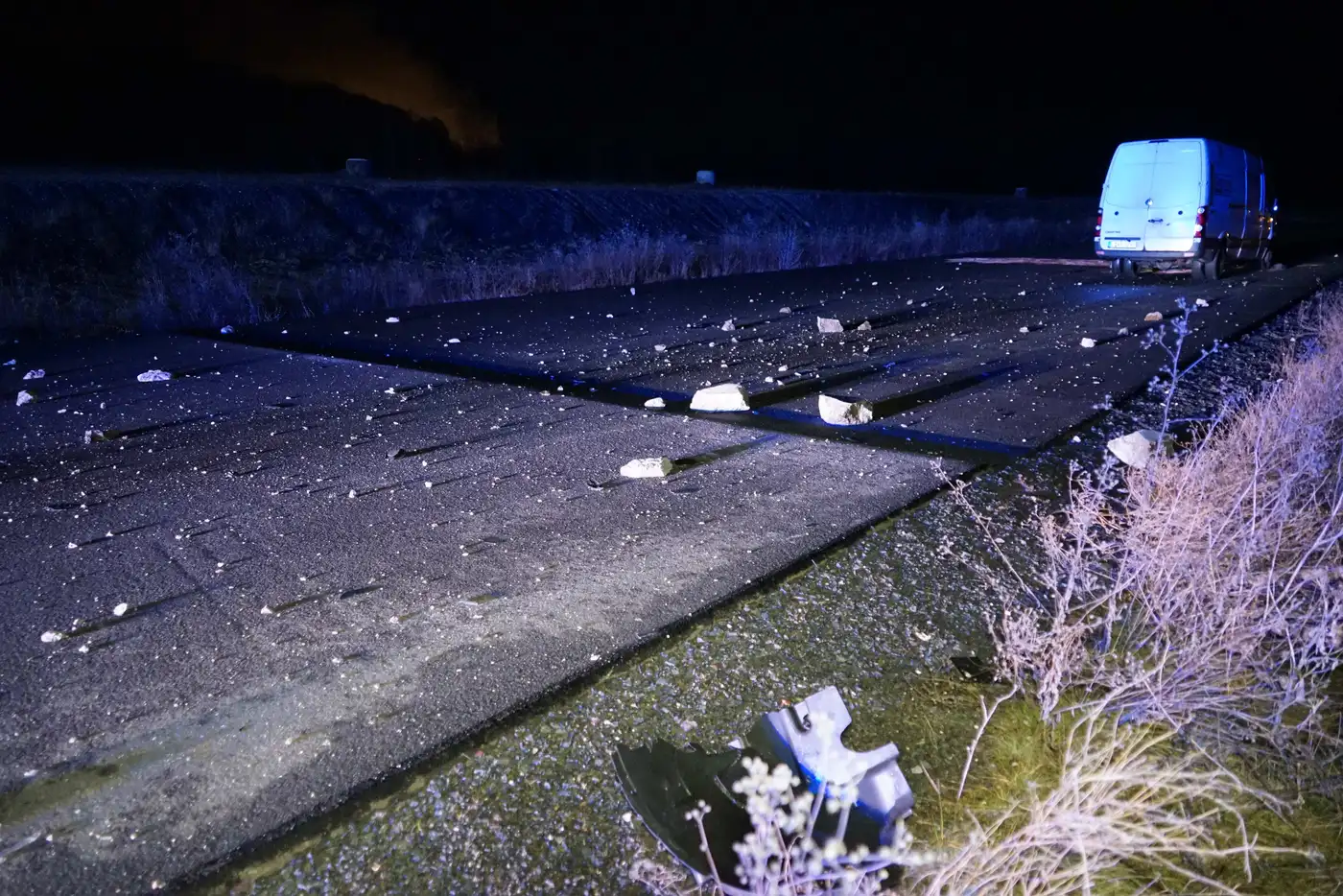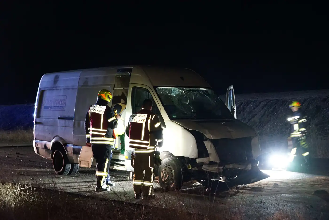 - Der schwer beschädigte Transporter mit Feuerwehrleuten an der Unfallstelle auf der A72 bei Rötha.