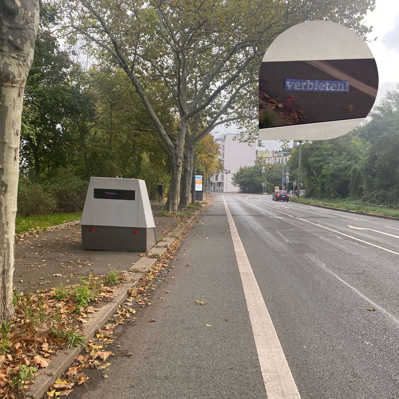 - Auf dem mobilen Blitzgerät hat jemand bereits einen Aufkleber hinterlassen.