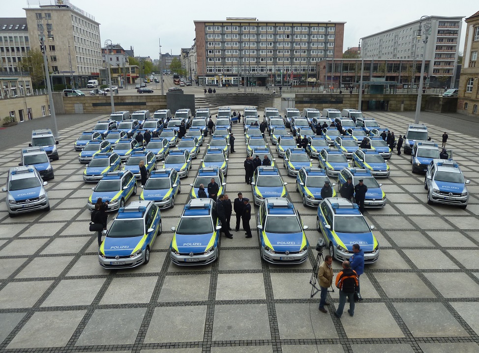 Ein Großaufgebot der Polizei hat am Freitag in der Chemnitzer Innenstadt für Aufsehen gesorgt. Beamten aus ganz Sachsen rückten auf den Theaterplatz aus - dort wurden am Mittag 70 nagelneue Polizeifahrzeuge an die Dienststellen übergeben. Der Fuhrpark besteht aus 40 Streifenwagen, 28 Transportern und zwei Geländewagen. 3,2 Millionen Euro hat der Freistaat in die Fahrzeuge investiert. Bei den 40 Interaktiven Funkstreifenwagen handelt es sich um den VW Golf 7 - Variant, die in St. Egidien bei Zwickau zu polizeilichen Einsatzfahrzeugen ausgebaut wurden. Die Fahrzeuge sind mit einem eigens entwickelten Sonderfahrzeugassistenten (SFA) ausgerüstet. Dem Funkstreifenwagen wird über den Fahrzeugassistenten der Einsatzauftrag übermittelt und die Navigation zum Einsatzort startet automatisch. Darüber hinaus können der Digitalfunk und die Sondersignalanlage mit diesem System gesteuert werden.