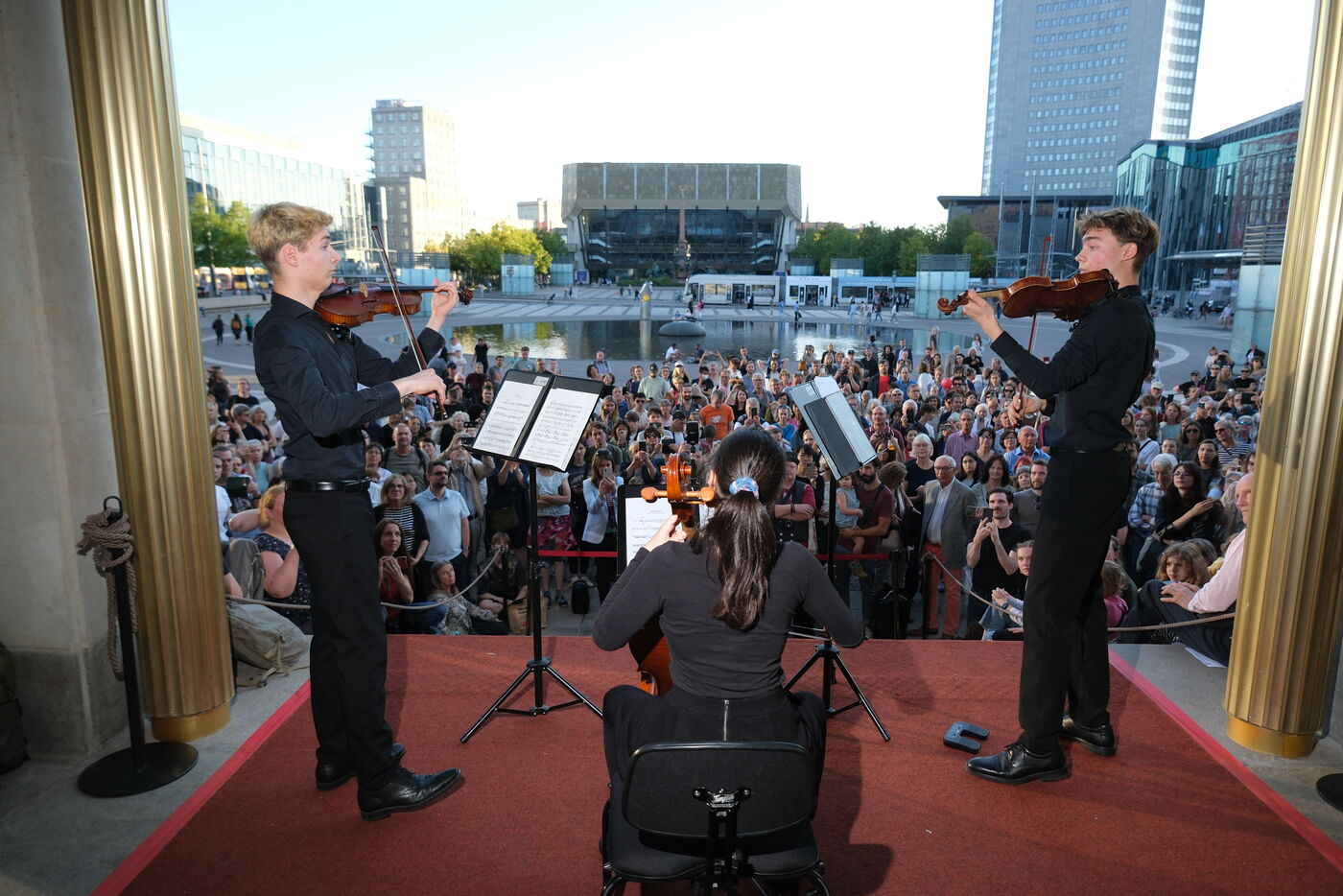 Zwei Geiger und eine Cellistin - junge Absolventen der Musikschule Leipzig „Johann Sebastian Bach“ - spielten das kurze Stück in der Oper im komplett gefüllten Foyer. Vor dem Gebäude warteten Dutzende Menschen. Das Trio wiederholte das Stück zweimal auf den Stufen zum Opernhaus unter freiem Himmel. Die Aufführung war kostenlos.
