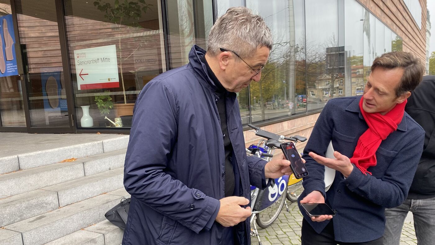 - Leipzigs Baubürgermeister Thomas Dienberg (li.) mit Sebastian Lindhorst (Chef der der Abteilung für Verkehrssicherheit und Beleuchtung des Mobilitäts- und Tiefbauamtes) bei der Vorstellung der neuen App am Dienstagvormittag in Leizig.