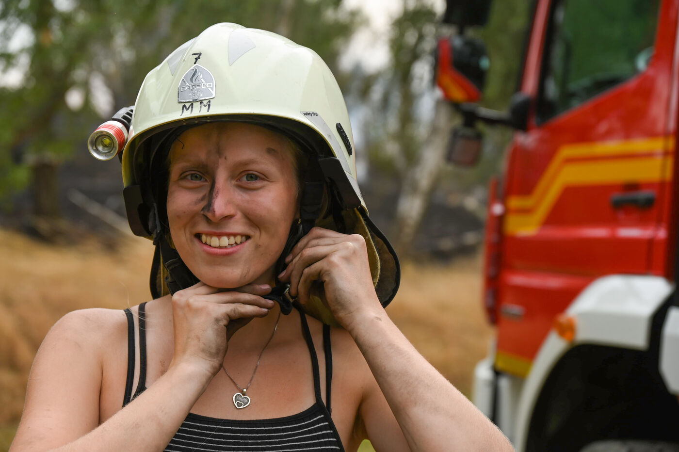 - Eine Feuerwehrfrau nach dem Einsatz.