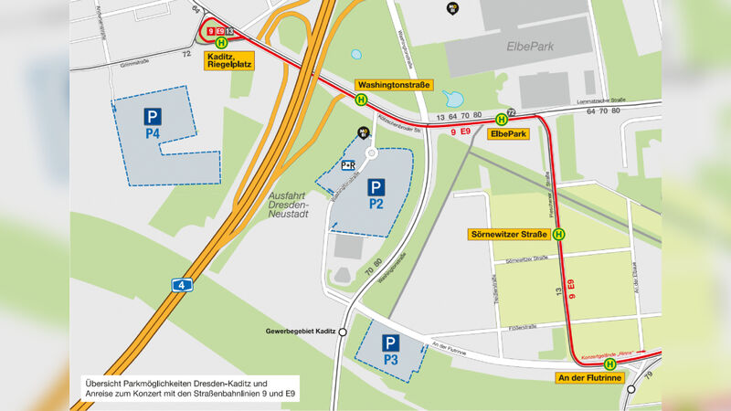 Neben den Übergangsstellen mit Parkmöglichkeiten in der Region gibt es auch am Dresdner Stadtrand viele Park+Ride-Plätze mit Bahnanschluss. Der direkt an der Autobahn liegende P+R-Platz in Kaditz wird um zusätzliche Flächen erweitert und hat mit den Linien 9 und E9 eine direkte Anbindung an das Konzertgelände. Aus dem Norden sind die Parkplätze an den Bahnhöfen Langebrück und Klotzsche gute Alternativen. Autofahrer können ihr Auto so am Dresdner Stadtrand abstellen und kostenfrei mit Zug, Bus und Bahn zum Konzert fahren.