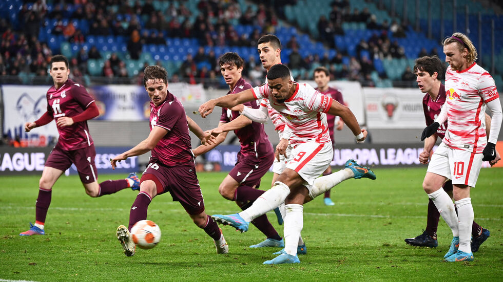 RB-Trainer Domenico Tedesco coachte in seinem ersten internationalen Spiel mit Leipzig im hellgrauen Mantel an der Seitenlinie. Der 36-Jährige hatte Anfang Dezember das RB-Traineramt übernommen, damals stand das Aus in der Champions League bereits fest. Eine Klasse tiefer gelang der Start für Tedesco aber überhaupt nicht wie erhofft: Nach einer Flanke von der linken Seite kam Le Normand am zweiten Pfosten frei zum Abschluss und traf zur frühen Führung der Gäste.