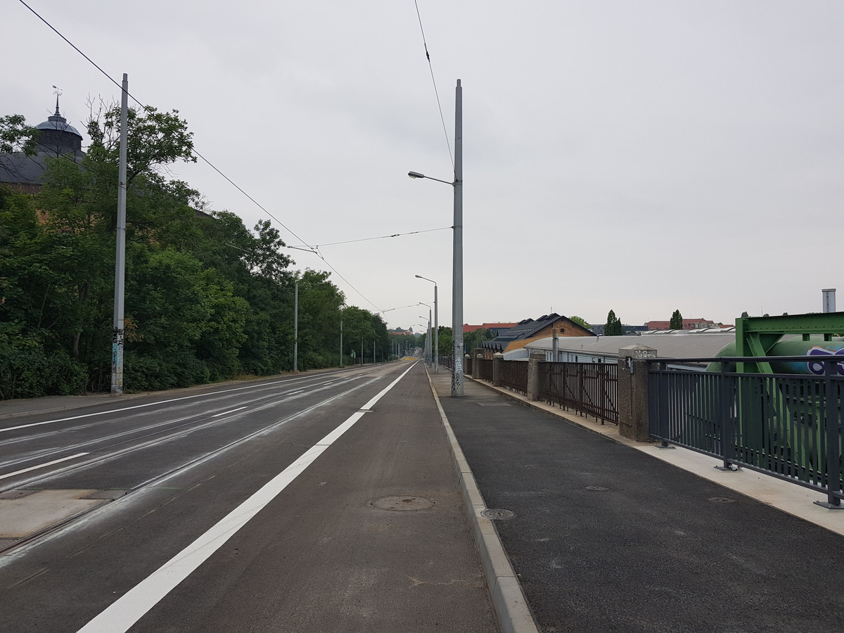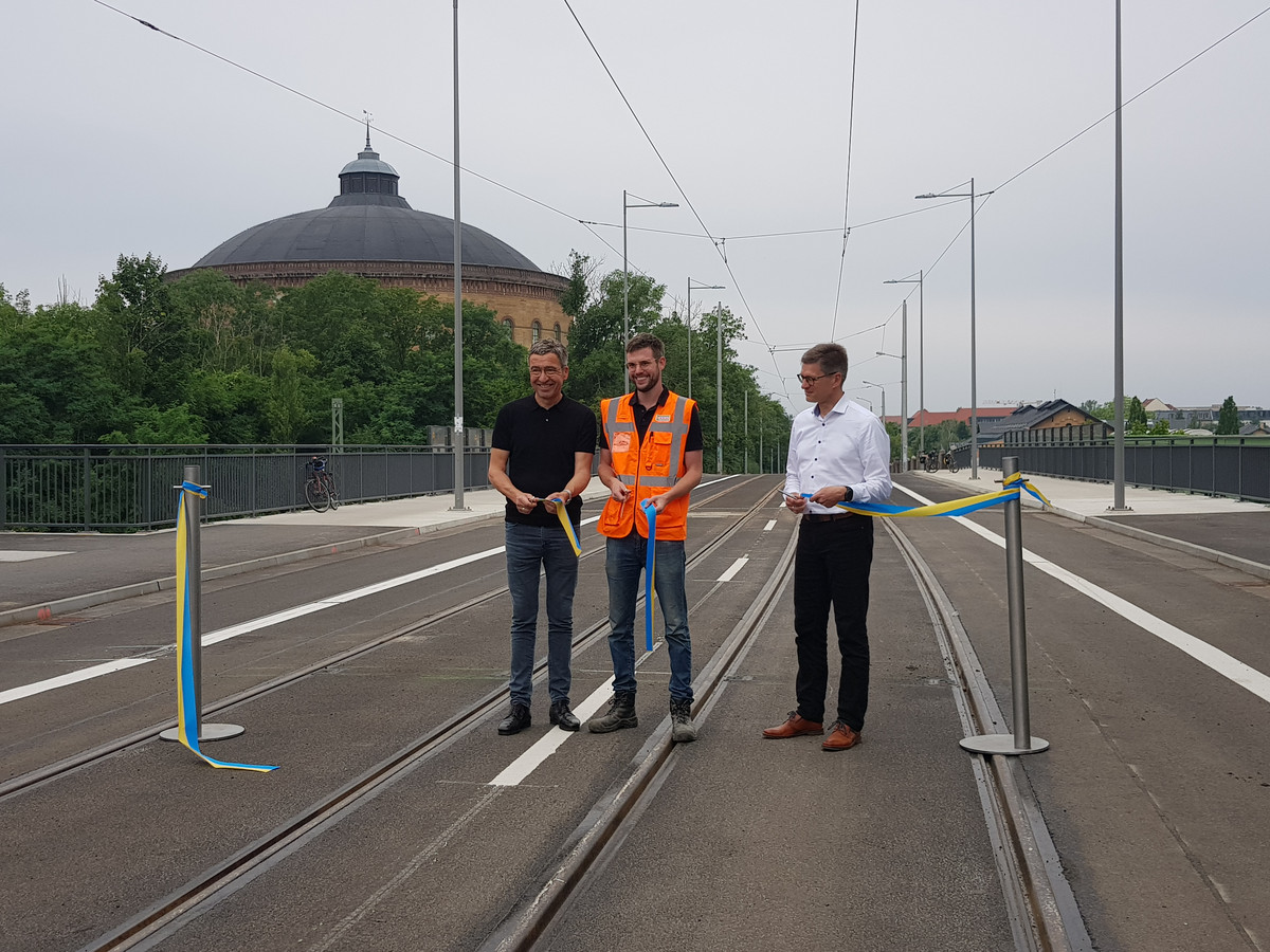 Nach mehr als einem Jahr Sanierungszeit wurde die Schlachthofbrücke an der Richard-Lehmann-Straße wieder für den Verkehr freigegeben. Laut der Stadt hatte vor allem Feuchtigkeit der Stahlkonstruktion zugesetzt. Um die beschädigten Teile zu ersetzen, musste der mittlere Teil der Brücke angehoben werden. Zudem wurden auch die Gleise, die Fahrbahnbeläge und die Straßenbeleuchtung erneuert. Rund 3,9 Millionen Euro hat die Stadt in die Instandsetzung investiert.