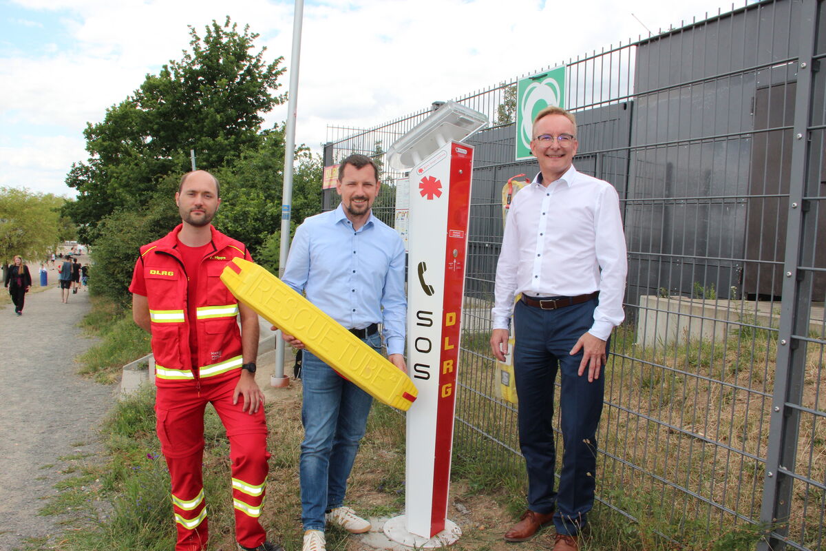 - Volker Hitte vom DLRG Wasserrettungsdienst, Christoph Kirsten, Geschäftsführer Entwicklungsgesellschaft für Gewerbe und Wohnen GmbH und Olaf Schlegel, Bürgermeister der Stadt Markkleeberg (von links nach rechts) und nehmen die Notrufsäule im Strandbad Markkleeberg-Ost am Markkleeberger See offiziell am 6. Juli 2023 in Betrieb.