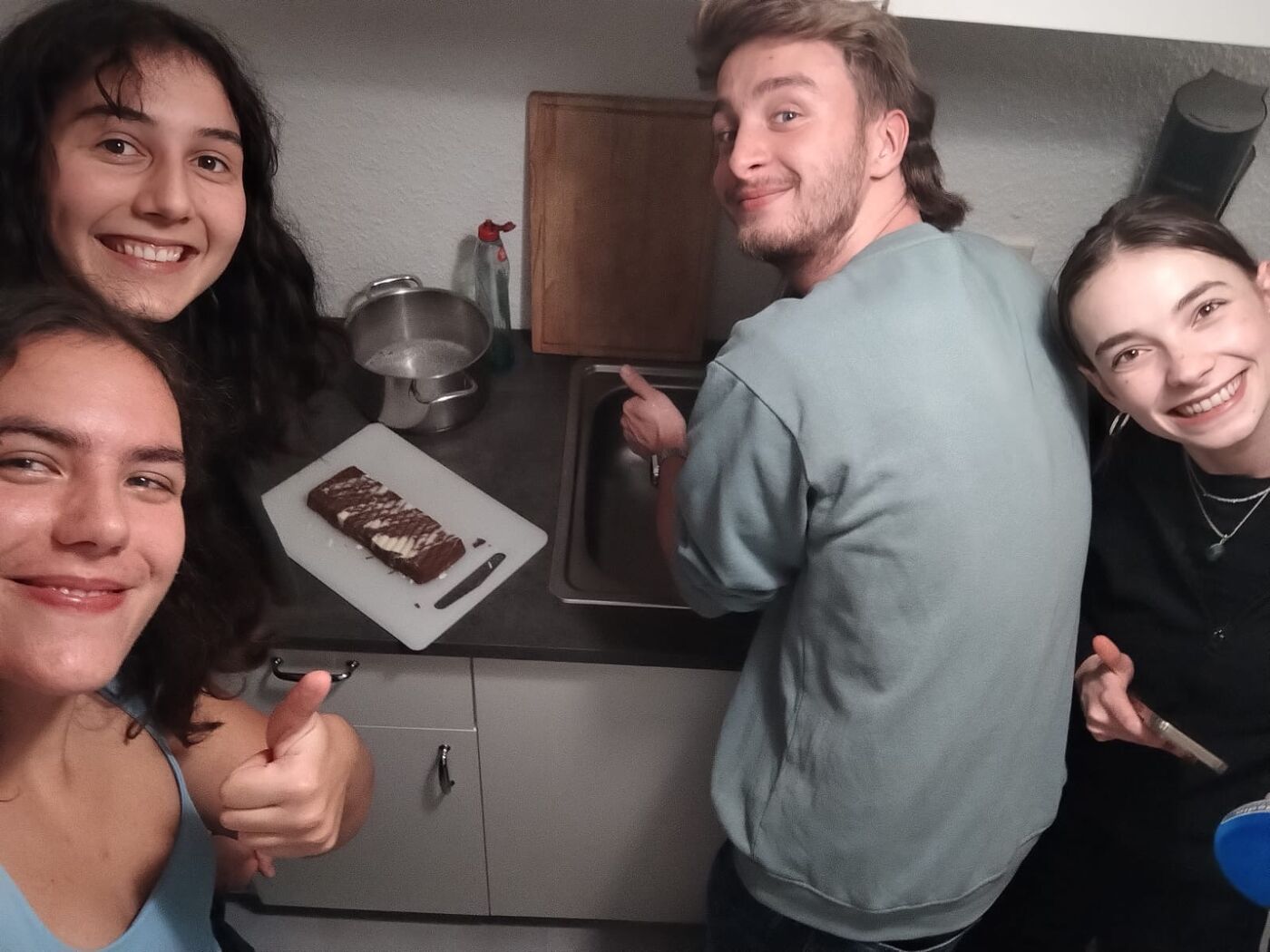 - Die Leipziger Dubai-Schoki-Profis (v.l.n.r.): Lena, Saskia, Valentin und Radio-Reporterin Evelyn Reimer.