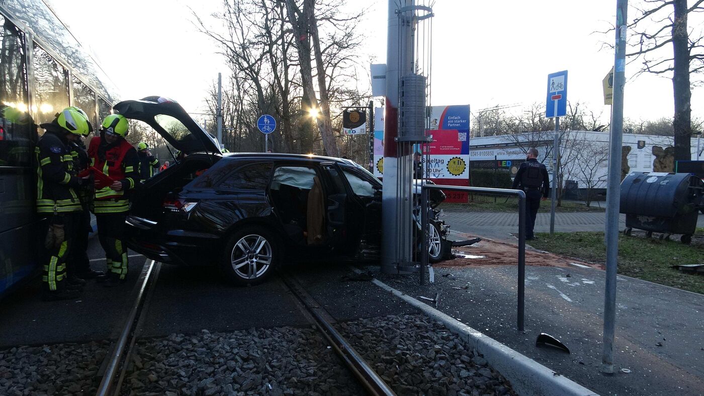 Wie die Polizei am Mittwochvormittag mitteilte, war die Audi-Fahrerin (58) stadteinwärt unterwegs. Beim Versuch, in die Waldstraße einzubiegen, habe sie die nahende Straßenbahn übersehen und es sei zu dem schlimmen Zusammenstoß gekommen. Das Auto wurde dabei noch mehrere Meter weit mitgeschleift. Die Frau wurde leicht verletzt. „Nach ersten Schätzungen entstand ein Gesamtschaden von 55.000 Euro“, so ein Polizeisprecher. „Der Verkehrsunfalldienst hat den Unfall aufgenommen und ermittelt zum Hergang.“