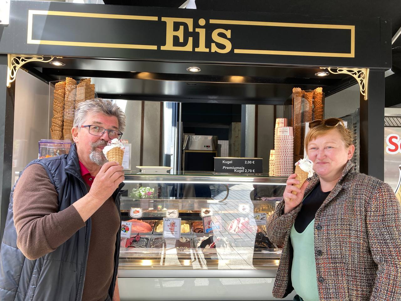 - Eisschlecken in der Leipziger Innenstadt: San-Remo-Eismanufaktur-Inhaber Eberhard Wiedenmann mit Katrin Henneberg von der Uni Leipzig.