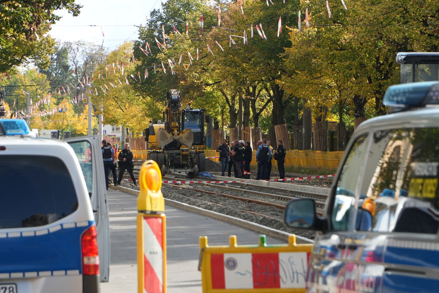 - Prager Straße: Blick auf die Unfallstelle. Der Bagger soll den Bauarbeiter überfahren haben.