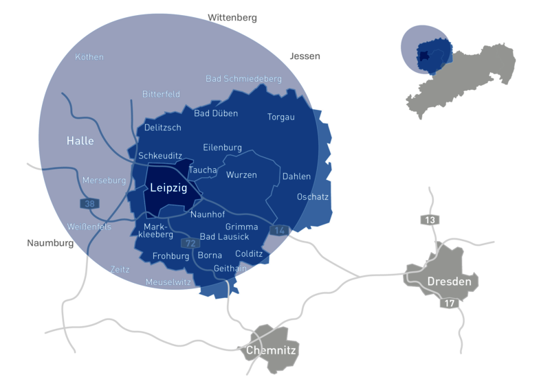 Radio Leipzig hören Sie sowohl im Stadtgebiet Leipzig inkl. Umland als auch in den Landkreisen Leipzig und Nordsachsen, Stadt Halle sowie in Teilen der Landkreise Anhalt-Bitterfeld, Saalekreis, Burgenlandkreis und Wittenberg. Auf unserer Karte sehen Sie, mit welcher Frequenz Sie uns in welchem Gebiet empfangen können.