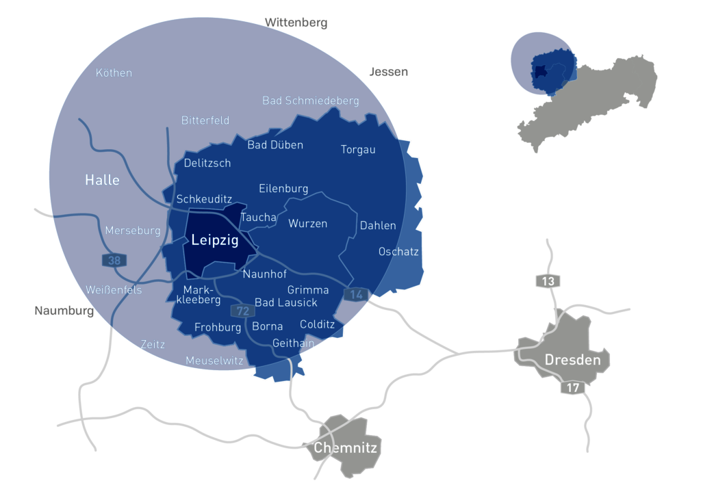 Radio Leipzig hören Sie sowohl im Stadtgebiet Leipzig inkl. Umland als auch in den Landkreisen Leipzig und Nordsachsen, Stadt Halle sowie in Teilen der Landkreise Anhalt-Bitterfeld, Saalekreis, Burgenlandkreis und Wittenberg. Auf unserer Karte sehen Sie, mit welcher Frequenz Sie uns in welchem Gebiet empfangen können.